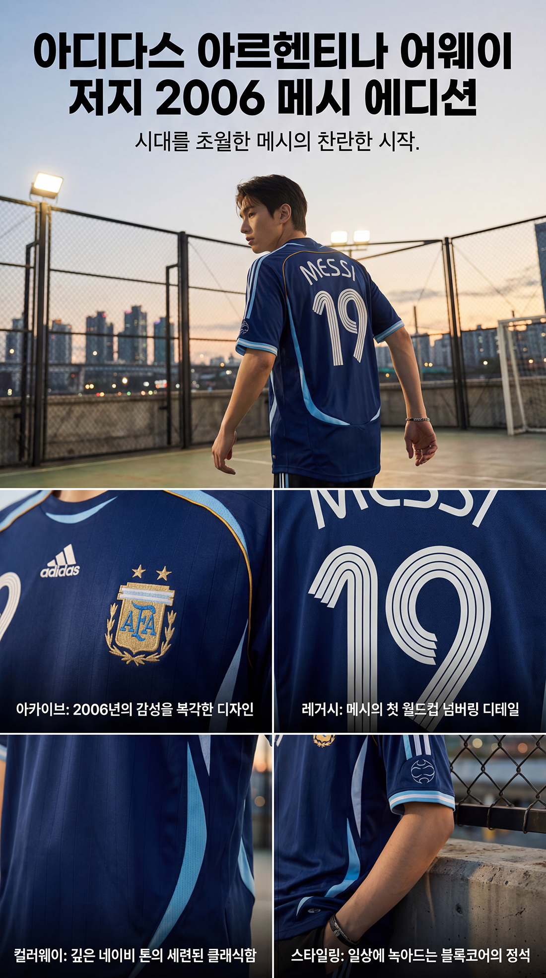 ¾Æ¸£ÇîÆ¼³ª ¾î¿þÀÌ ÀúÁö 2006 ¸Þ½Ã ¿¡µð¼ÇÀ¸·Î Ã౸ÀÇ ¿µ±¤À» ´Ù½Ã ´À²¸º¸¼¼¿ä. Ã౸ ¿ª»ç»ó °¡Àå »ó¡ÀûÀÎ ½Ã±â Áß Çϳª¸¦ ±â³äÇϸç 2006³â ¿ùµåÄÅ ´ç½Ã ¾Æ¸£ÇîÆ¼³ª ±¹°¡´ëÇ¥ÆÀÀÌ Âø¿ëÇß´ø Ŭ·¡½ÄÇÑ µðÀÚÀÎÀ» µÇ»ì·È½À´Ï´Ù. ¸Þ½ÃÀÇ À̸§°ú ¹øÈ£°¡ µé¾î°¡ ÁøÁ¤ÇÑ Ã౸ ÆÒÀ̶ó¸é ¼ÒÀå °¡Ä¡°¡ ´ÙºÐÇÕ´Ï´Ù. °íǰÁú ´õºí ´ÏÆ® ¿ø´ÜÀ¸·Î Á¦ÀÛµÇ¾î °æ±âÀå ¾ÈÆÆ¿¡¼ Æí¾ÈÇÏ°Ô Âø¿ëÇÒ ¼ö ÀÖ½À´Ï´Ù. °¡½¿ ºÎºÐ¿¡´Â ¾Æµð´Ù½º ºê·£µùÀÌ »õ°ÜÁ® ÀÖÀ¸¸ç, ¿·¸é¿¡´Â ½Ã±×´ÏÃÄ 3-½ºÆ®¶óÀÌÇÁ°¡ ÆîÃÄÁ® ÀÖ½À´Ï´Ù. °æ±âÀå¿¡¼´Â ¹°·Ð ÀÏ»óº¹À¸·Î Ȱ¿ëÇϸç Ã౸¸¦ ÇâÇÑ ¿Á¤°ú Ç츮ƼÁö¸¦ µå·¯³¾ ¼ö ÀÖ´Â ¾Æµð´Ù½ºÀÇ Å¬·¡½ÄÇÑ ÀúÁö·Î ¸Þ½Ã¿Í ¾Æ¸£ÇîÆ¼³ª ÆÀÀÇ À¯»êÀ» ¿¹ÂùÇϼ¼¿ä.